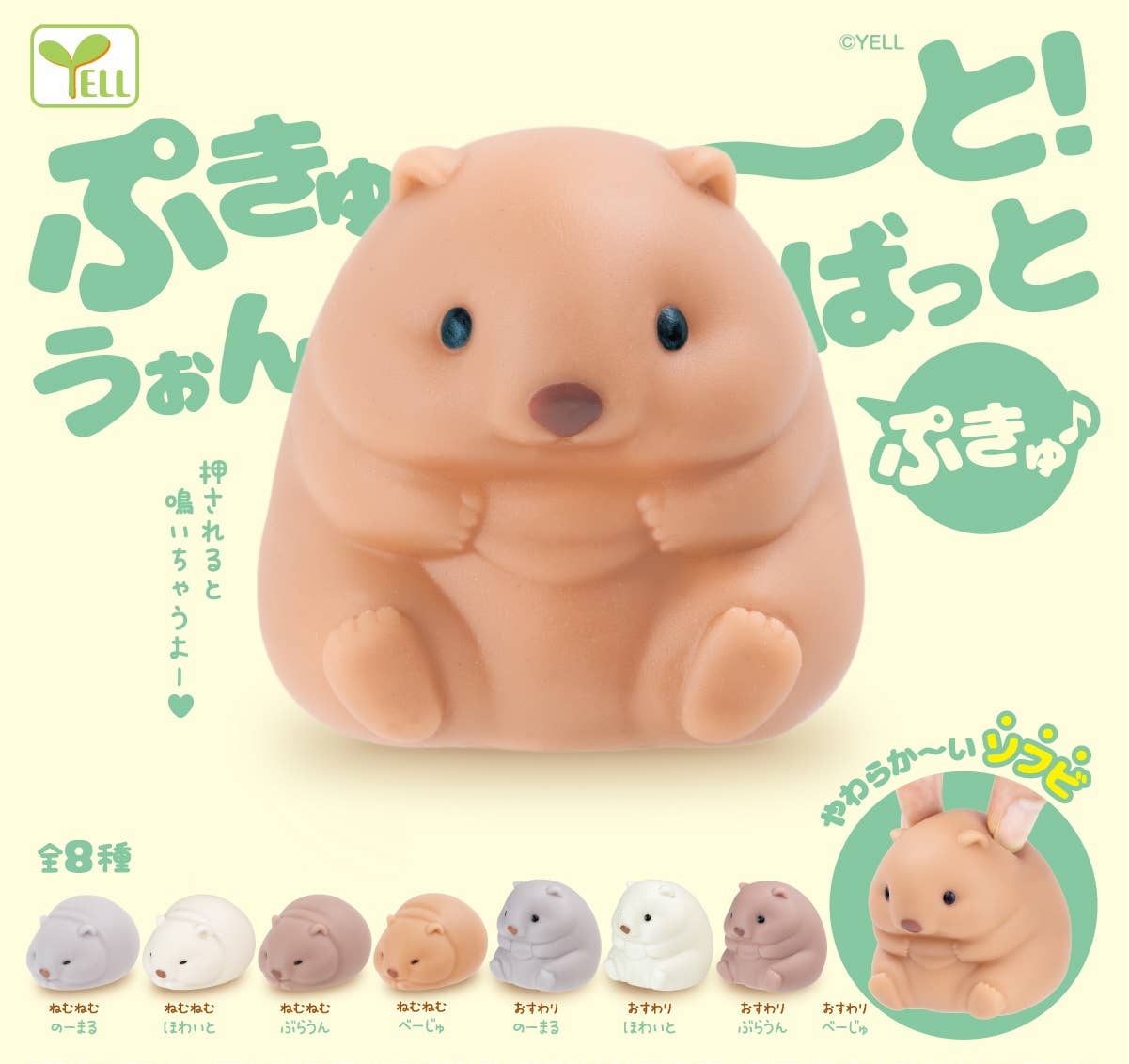 One random Assorted Wombat Figurine Capsule by Yell Japan. Mini Japanese figurine toys packaged in a see-through capsule; imported from Japan. Known as GASHAPON (ga-sha-pon) GAME in Japan; where you receive a random figurine with each purchase through a machine. Each Capsule is sealed and is 100% recyclable.